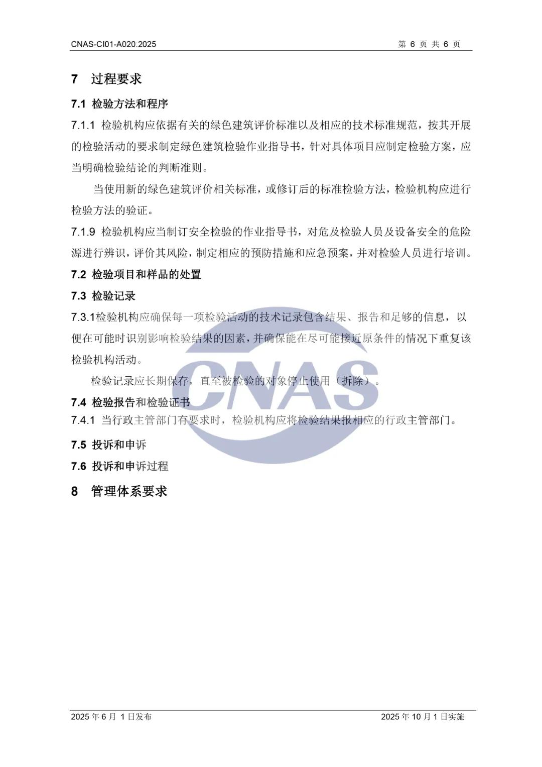 为进一步规范绿色建筑领域检验机构认可,中国合格评定国家认可委员会(CNAS)秘书处近期组织制订了CNAS-CI01-A020:2025《检验机构能力认可准则在绿色建筑检验领域的应用说明》,现已发布,将于2025年10月1日实施。