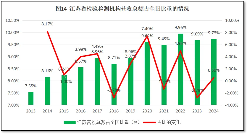 由图14可见,江苏省检验检测机构营收总额在全国检验检测行业营收总额中的比重总体来说逐年增加,从2013年的7.55%上升到2024年的9.73%。占比增幅呈现振荡波动的特点,各年有正有负,占比最高的年份出现在2022年,一度达到9.96%,2023年有所下降,但2024年又有轻微反弹。总的来看,从营收状况来说,江苏省检验检测行业发展还存在比较大的后劲,成长步伐十分稳健。
