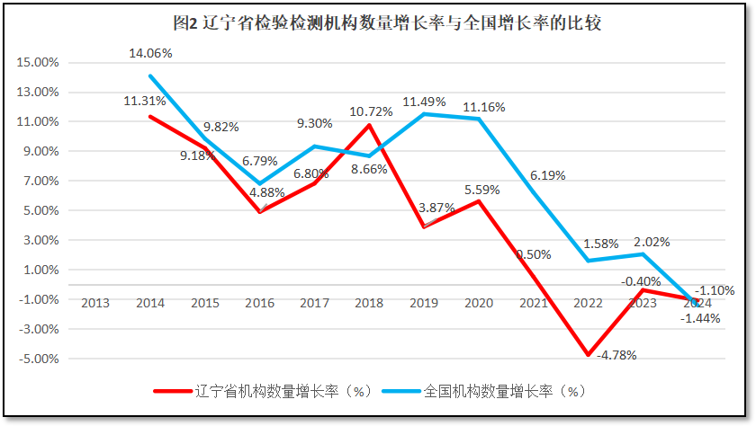 河北省检验检测机构数量增长率与全国检验检测机构数量的增长率进行比较,如图2所示。
