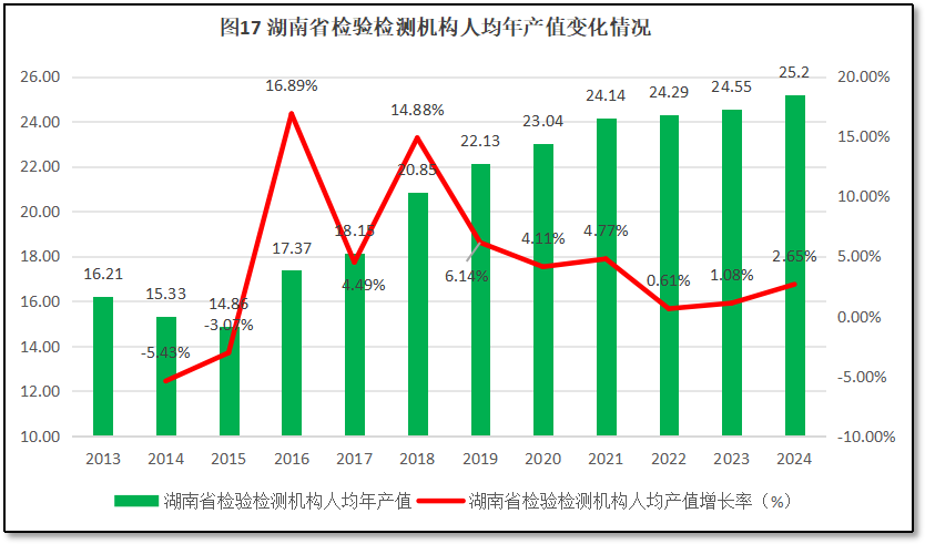 由图17可见,12年来,湖南省检验检测机构人均年产值总体保持增长,仅在2014-2015年出现过同比下降的情况,其余年份均保持正增长。2024年湖南省检验检测机构的人均年产值为25.2万元,是2013年的1.55倍。从增长率来看,湖南省人均年产值同比增幅曲线在2016年和2018年先后出现了同比增幅16.89%和14.88%两个增长峰值,在2018年之后同比增幅逐步走低,不过最近两年增长率有缓慢回升的趋势,2024年度同比增幅为2.65%。