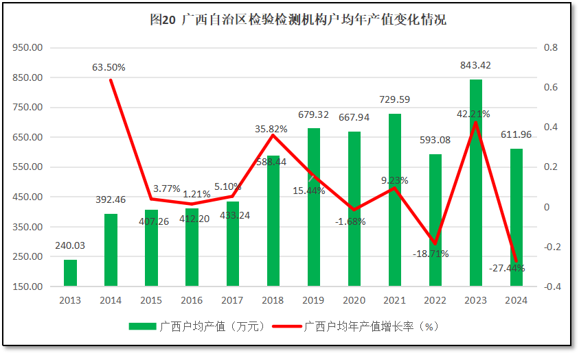 由图20可见,广西壮族自治区检验检测机构户均营收从2013年的240.03万元经过几次起起伏伏后,2024年为611.96万元,是2013年的2.55倍。从增长率的曲线来看,除了头两年数据误差导致增长率异常之外,在2018年和2023年广西先后出现35.82%和42.21%两次大幅增长,拉高了广西壮族自治区检验检测机构户均营收的基数。不过,2022年和2024年广西出现两次户均营收的较大降幅,一定程度上拉低了广西壮族自治区检验检测机构户均营收的年均增长率。2015年以来广西检验检测机构户均年产值的复合年增长率为6.5%,较2023年同期数据有较大降幅。可见,由于处于行业转型期间,且区域经济不够发达,广西省检验检测行业统计数据各年起伏很大,说明行业发展不稳定、不成熟。