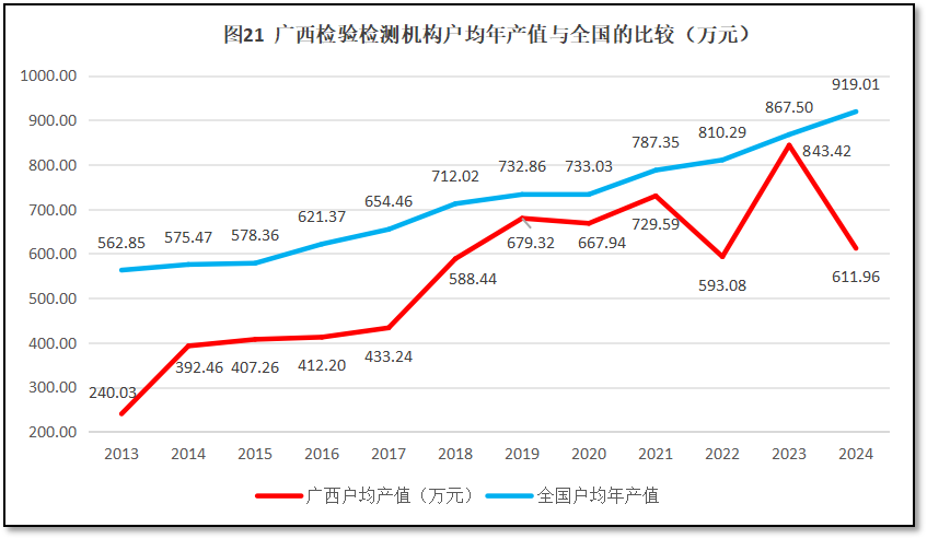 广西壮族自治区检验检测机构户均营业收入与全国情况的比较如图21所示。