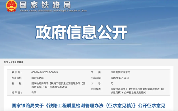 2026年3月3日,国家铁路局正式发布通知,就《铁路工程质量检测管理办法(征求意见稿)》向社会公开征求意见,此举旨在强化铁路工程质量检测全流程监管,提升行业规范化、专业化水平,保障铁路建设质量安全。